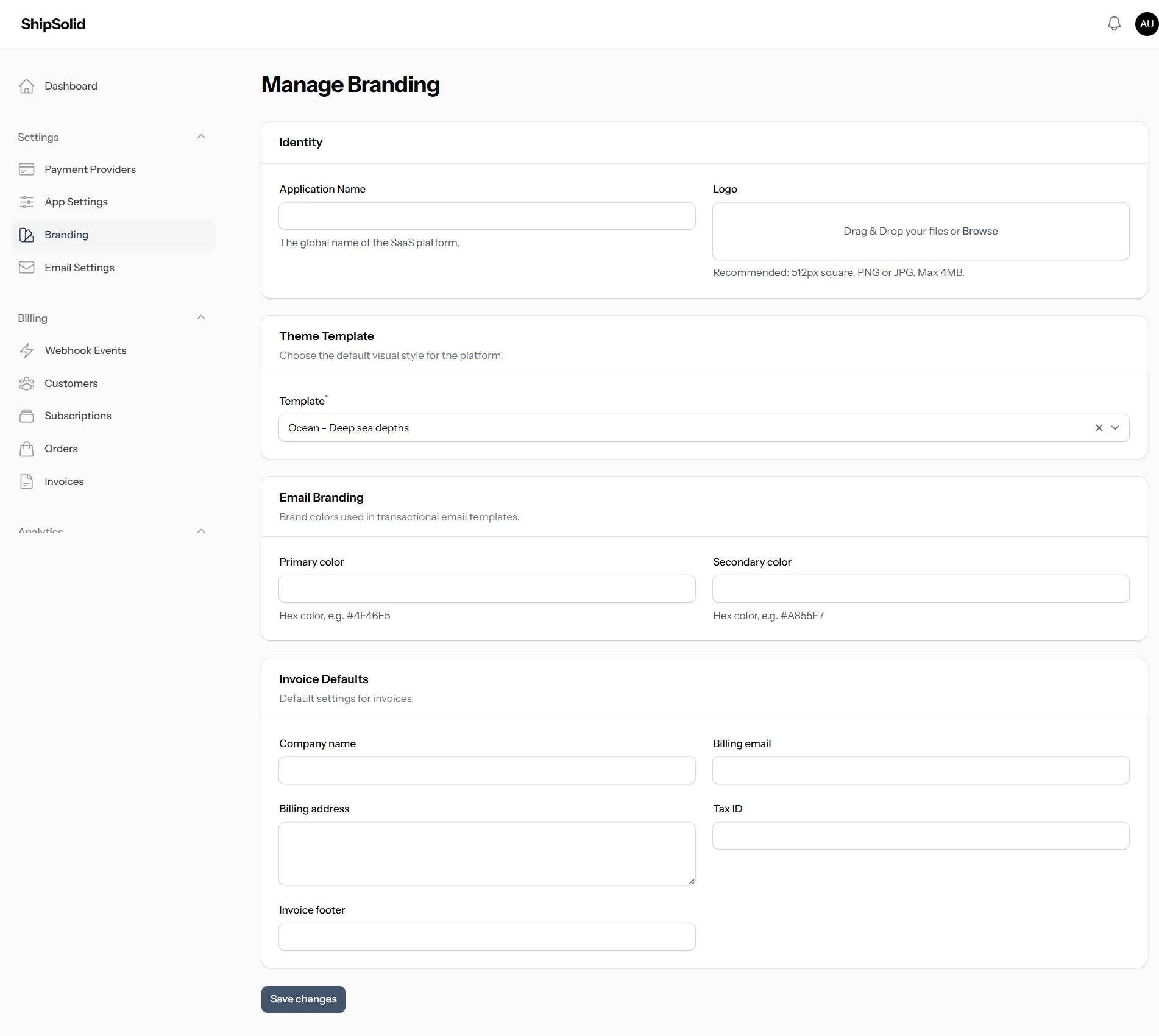 Centralized controls for identity, theme template, and defaults.